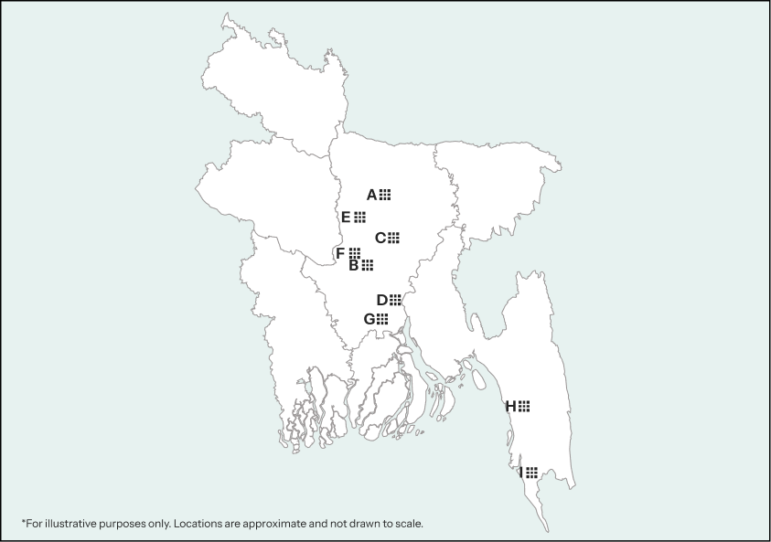 Mymensingh(A), Dhaka(B), Gazipur(C), Narayanganj(D), Tangail(E), Manikganj (F), Munshiganj(G), Chattogram(H), Cox's Bazar (I)